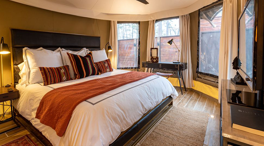 业态融合与体验升级: 帐篷酒店已成为链接多元文旅业态的关键节点。在云途超5,000个项目中,高端文旅占比逾40%。以横店影视城梦泉谷栖谷野奢帐篷酒店为例,80余座庭院式帐篷巧妙串联温泉、房车营地、萌宠互动区等业态,打造“住宿+娱乐+社交”一站式目的地,试运营即引发预订热潮,备受年轻客群及亲子家庭青睐。