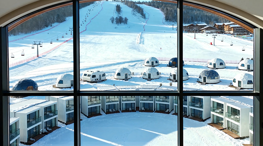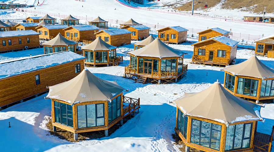 走近些,才更真切地感受到这份震撼。每一顶帐篷都稳稳地安置在精心搭建的木质平台上,与周围的雪景相得益彰。帐篷的外观设计简洁而富有现代感,透明的部分巧妙地融入其中,既能让人在屋内尽情欣赏外面的冰雪世界,又保证了充足的采光。
